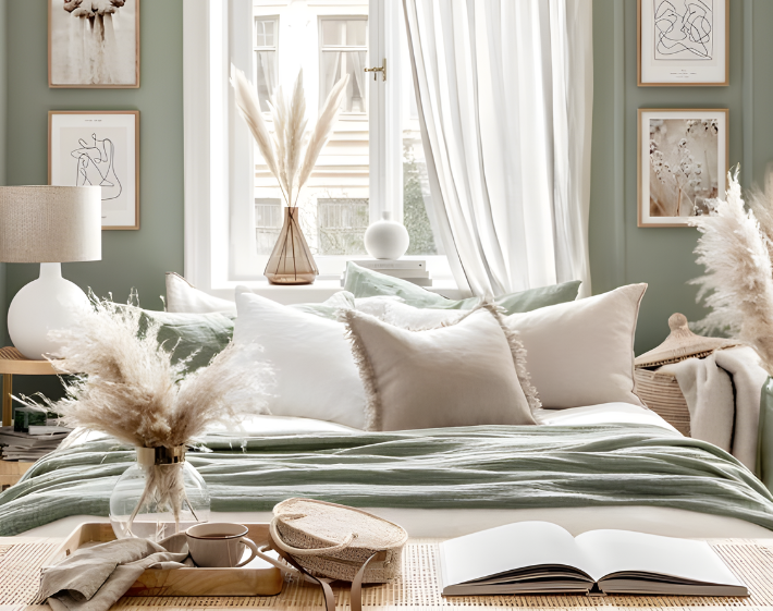 Transformez votre chambre en une oasis en ne peignant seulement qu’un. Cette teinte crée une ambiance relaxante, parfaite pour favoriser le sommeil. Associez-la à du linge de lit aux textures luxueuses, comme le lin ou le velours, pour un confort visuel et tactile. Intégrez également des éclairages tamisés pour renforcer l’atmosphère apaisante.
